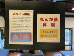 実際に迫り出し構造のレンガ積み体験を行いました。