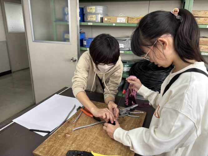 1年生も入学して第二種電気工事士に合格し、体験者に電気工事を教えられるようになりました。