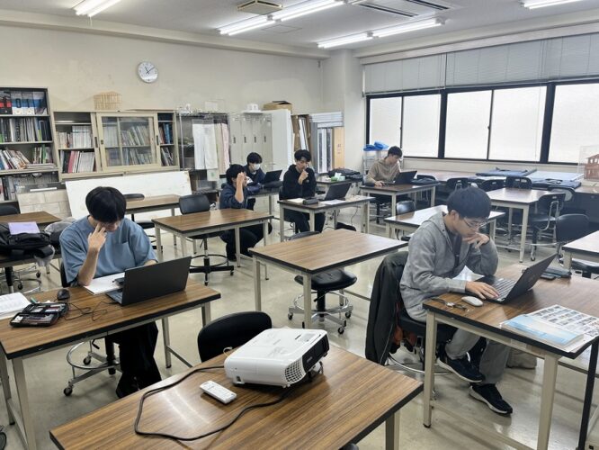 建築工学科2年次は、設計課題とインテリア課題に分かれて制作を行ってきましたが、建築工学研究科では全員で設計課題に取り組みます。