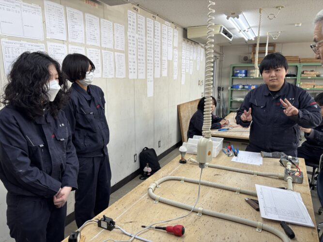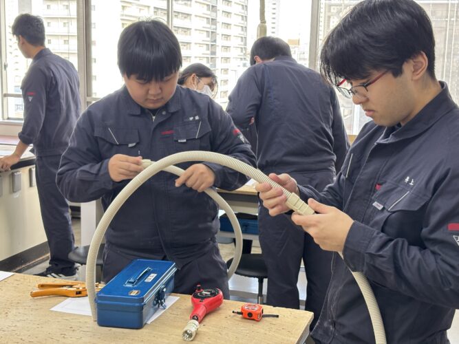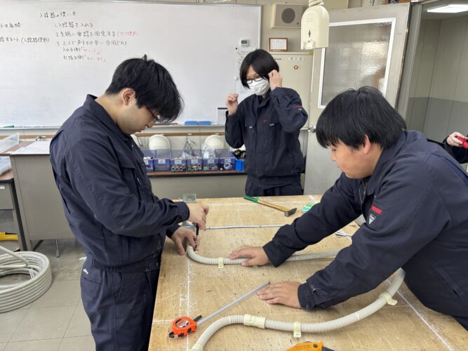 一年生の合成樹脂可とう電線管(PF管)の工事実習の様子をお伝えします。
