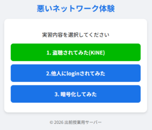 授業では、通信の盗聴、ログインのなりすまし、暗号化の有無による違いなどを実際に体験しながら、