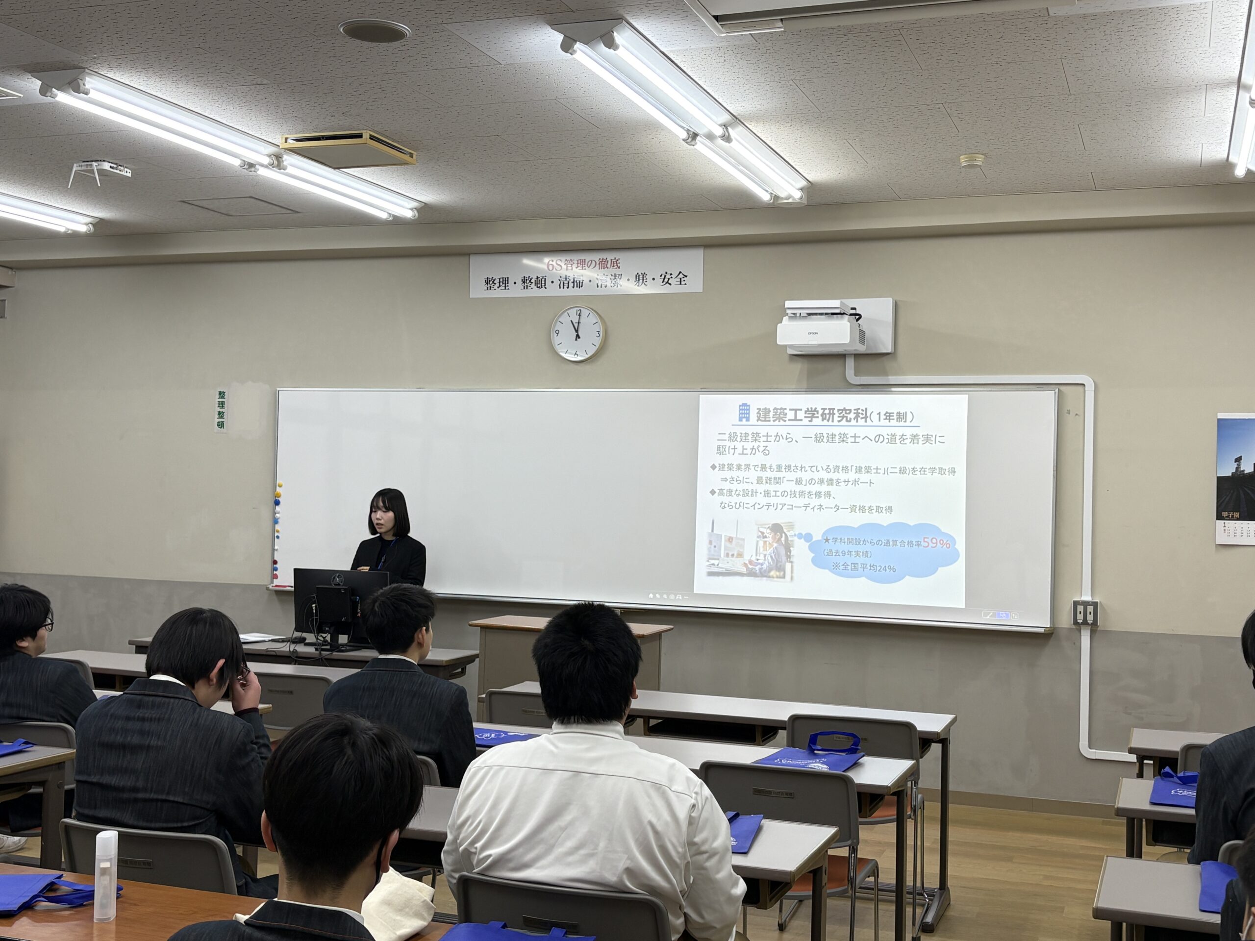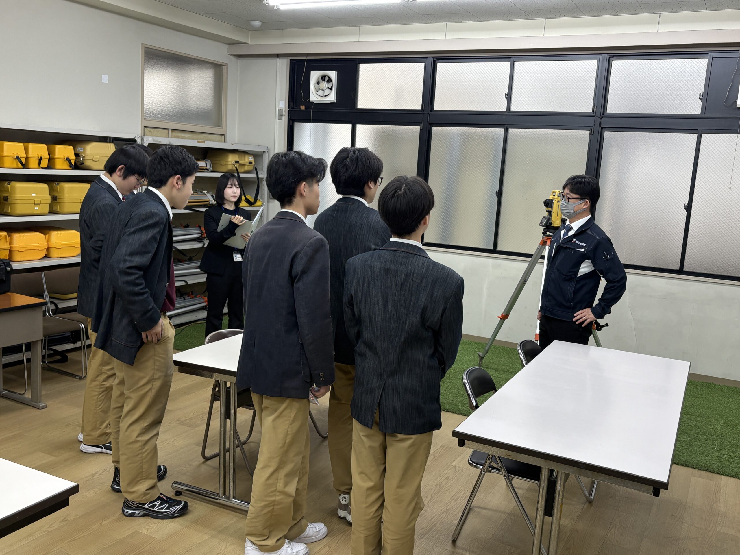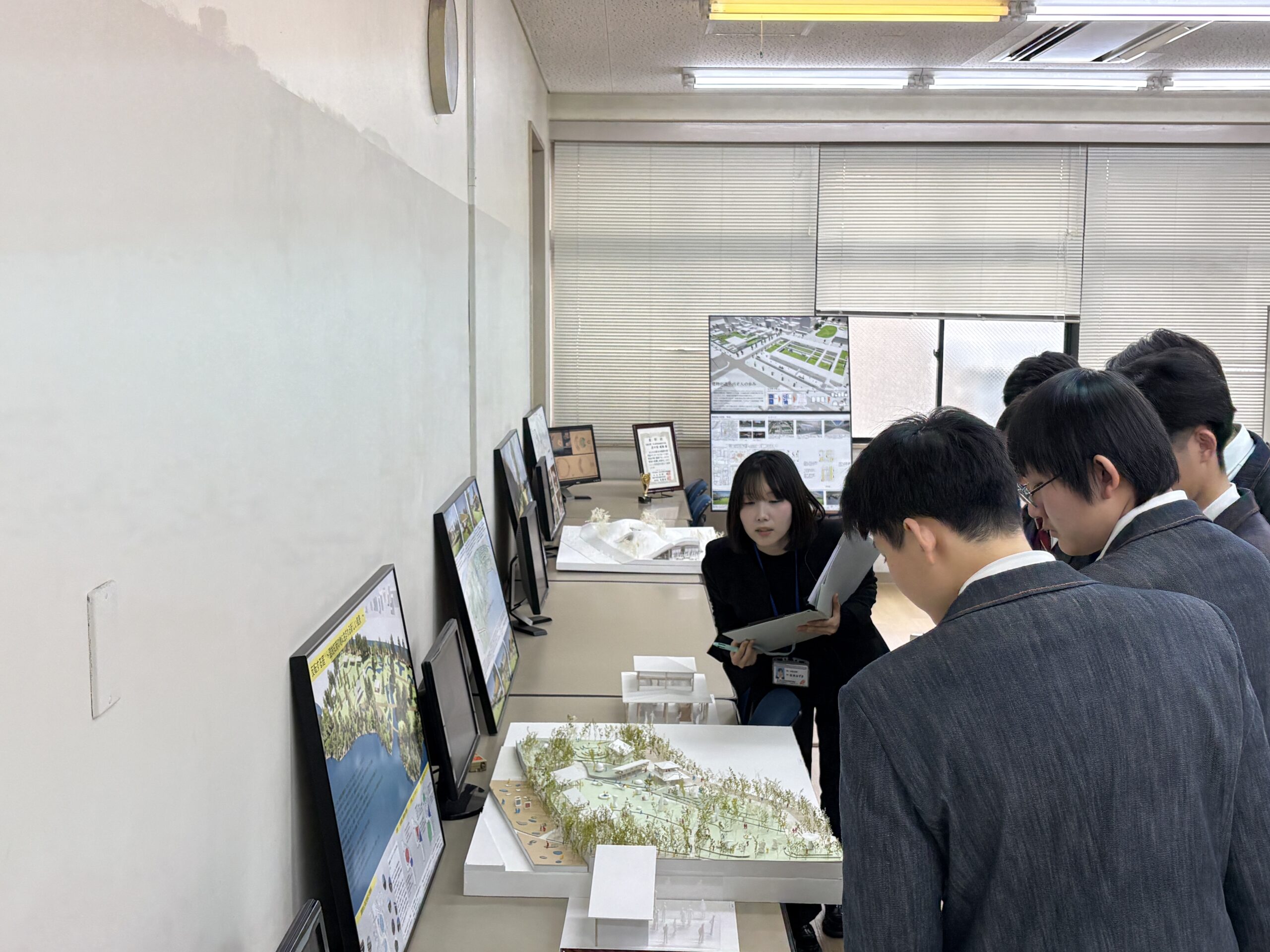 本校の特徴や学べる学科についてご紹介した後、建築工学科・建築工学研究科の学生作品や、測量環境工学科の授業で使用する機材などをご覧いただきました🔧