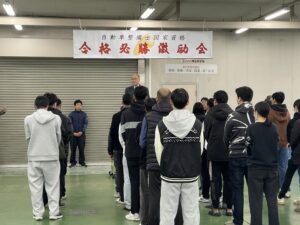 自動車整備士登録試験に向けて 「自動車整備士国家資格 合格必勝激励会」を開き、本校の理事長、校長が学生たちを鼓舞しました。